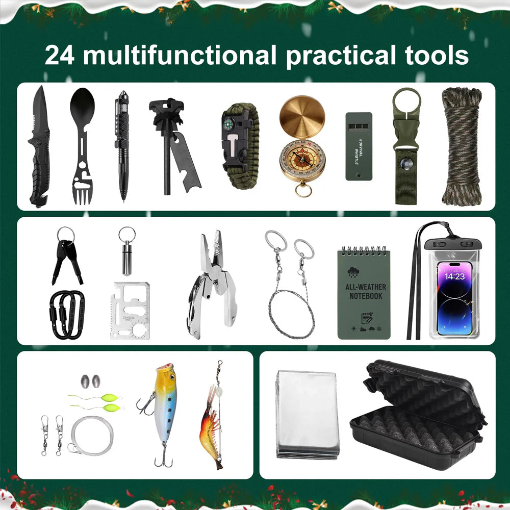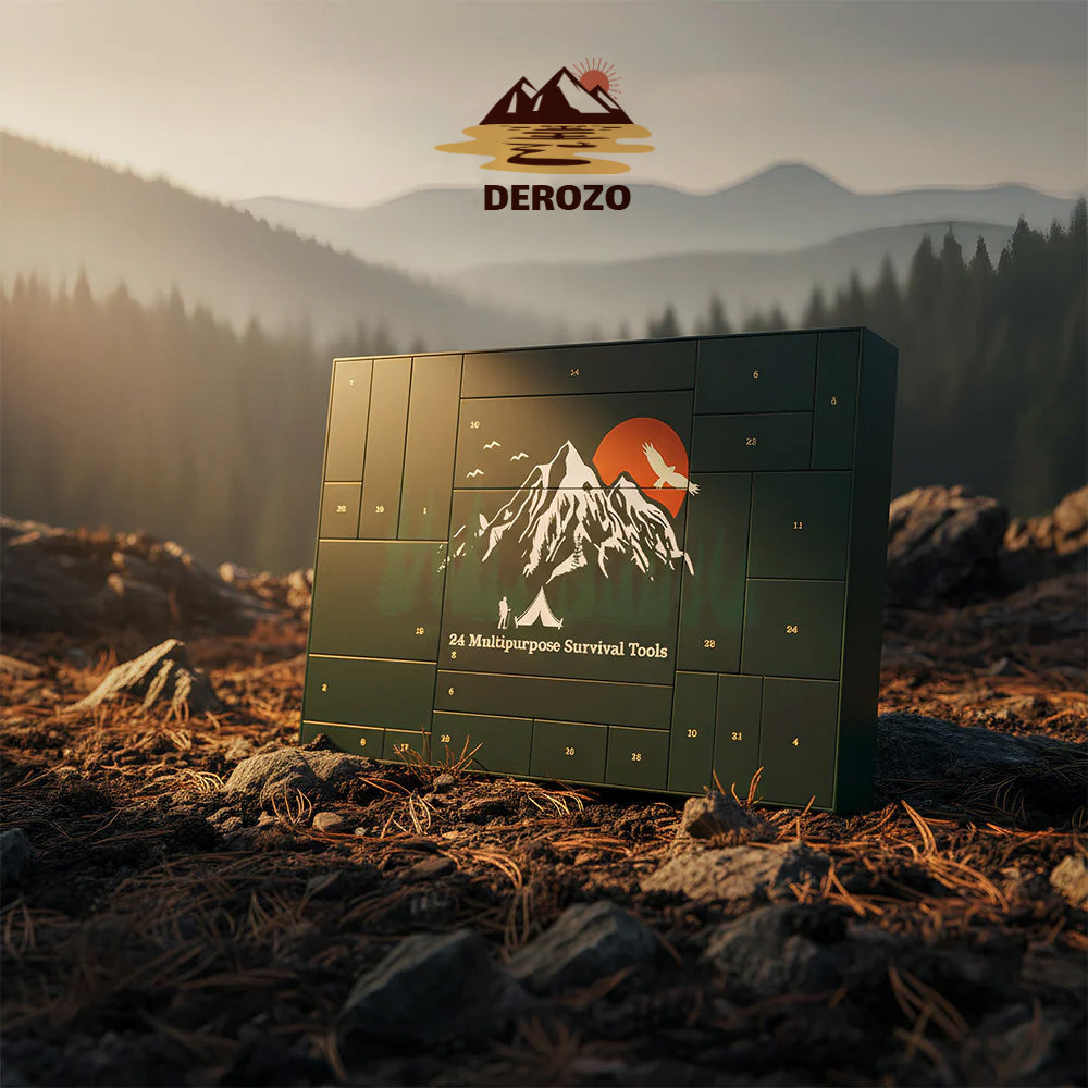 Our Derozo™ Advent Calendarincludes 24 practical survival and outdoor tools such as a tactical knife, flashlight, multi-tool card, paracord bracelet with compass and whistle, fire starter, wire saw, emergency blanket, fishing gear, all-weather notebook, and more. Each item is placed behind its own numbered door for a fun, surprise-filled unboxing experience.