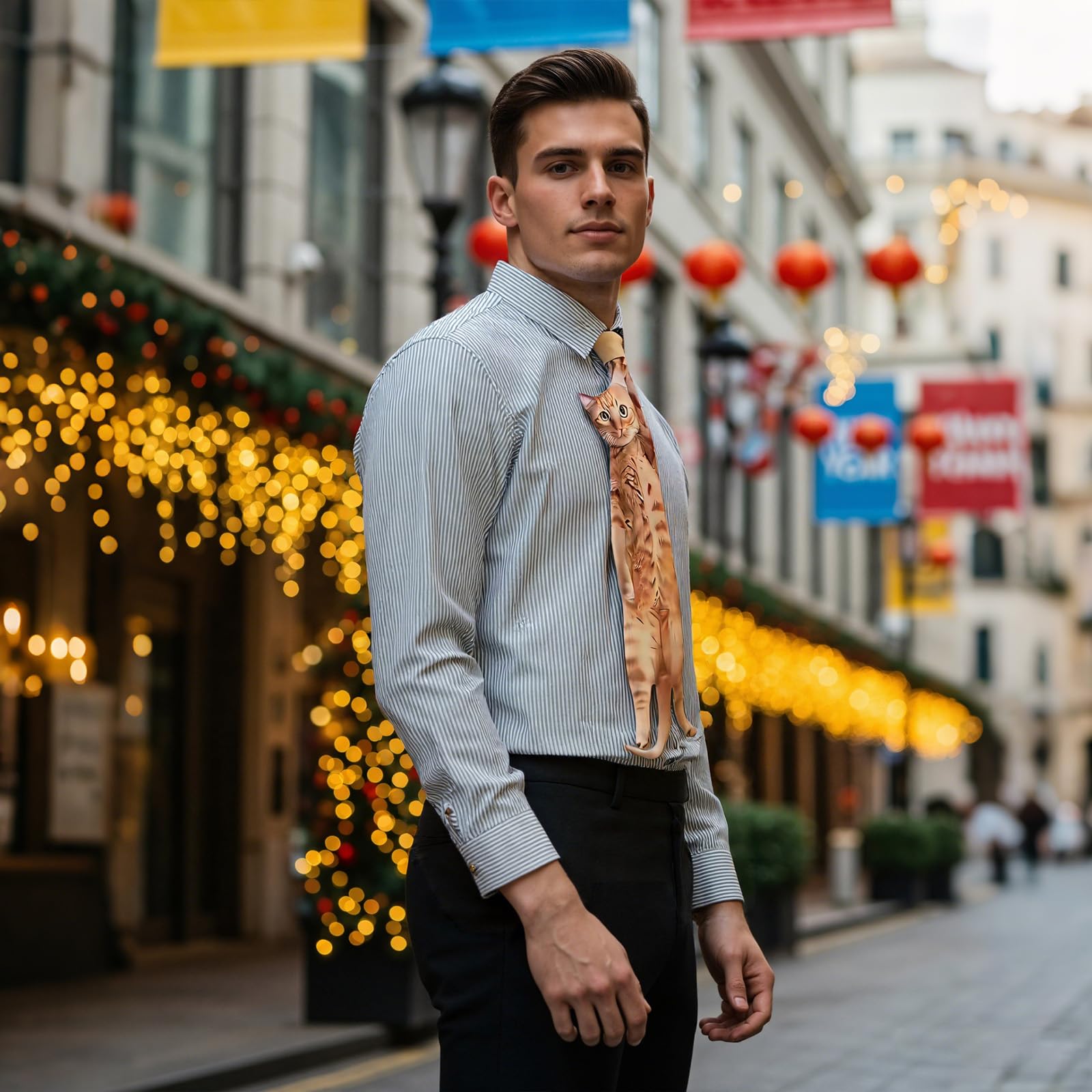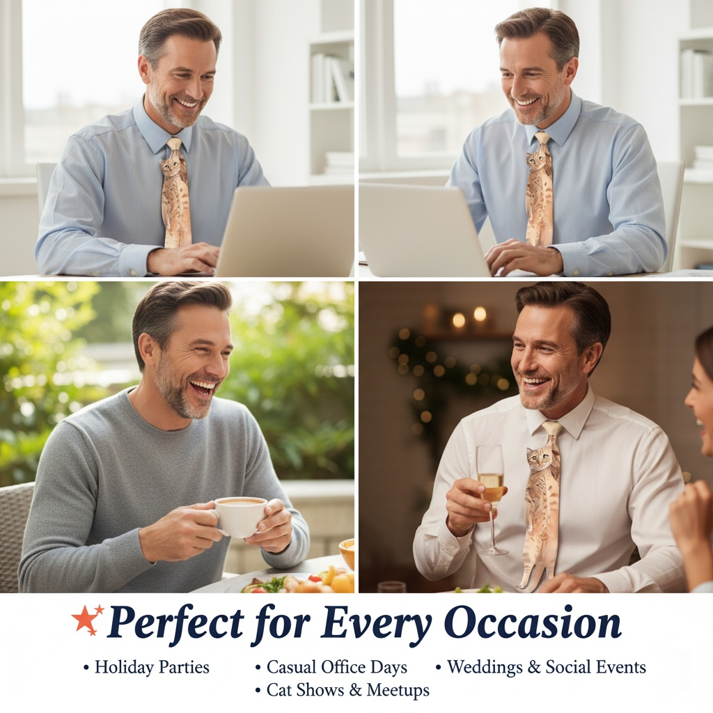 - 🎨 Unique Vertical 3D Design: Unlike traditional printed ties, our realistic cat body design mimics the look of a curious feline climbing up your shirt, creating a stunning visual effect that stands out in any crowd.